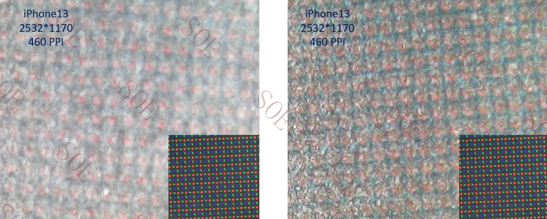 市面上普通3A膜(左)与昇印低闪3A膜(右)对比,可见普通3A膜碎花纹严重,而昇印低闪3A膜则没有碎花纹。碎花纹的产生会严重影响视觉感官体验。
