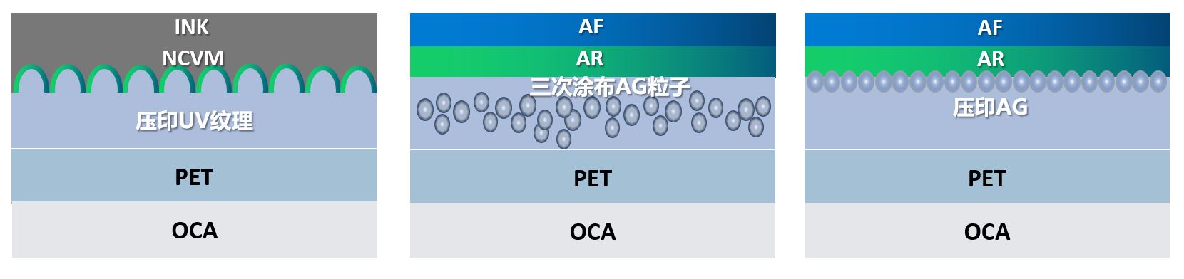 AG(Anti-Glare):减少镜面反射,通过扩散反射光达到防眩光,和遮挡折痕(折叠屏)