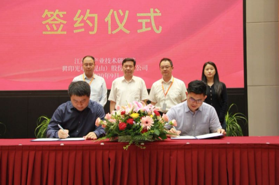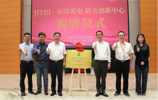 2020年9月22日,江苏省产业技术研究院与昇印光电(昆山)股份有限公司举行了签约揭牌仪式,共建“JITRI-昇印光电联合创新中心”。江苏省产业技术研究院党委书记胡义东、信息事业部副主任张赟、昆山高新区管委会副主任孔维华、高新区科技局局长熊伟、高新区科技局副局长虞亮、高新区招商服务局副局长胡芸、昇印光电总经理高育龙、昇印光电首席科学家岳威等领导专家出席签约揭牌仪式。